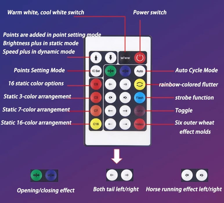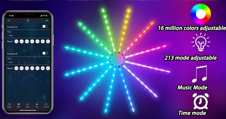 You can choose 16 colors and 10 lighting modes through the remote control. However, through the mobile APP, you can use 16 million colors adjustable and 213 lighting modes, each mode is exciting and brings you endless surprises.